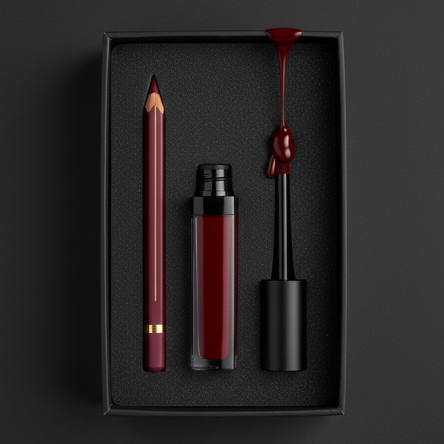 This exquisite set features a meticulously crafted lipliner pencil and a luxurious liquid lipstick in a stunning, deep crimson shade. Presented in elegant, minimalist black packaging, this duo is designed for the ultimate lip look.