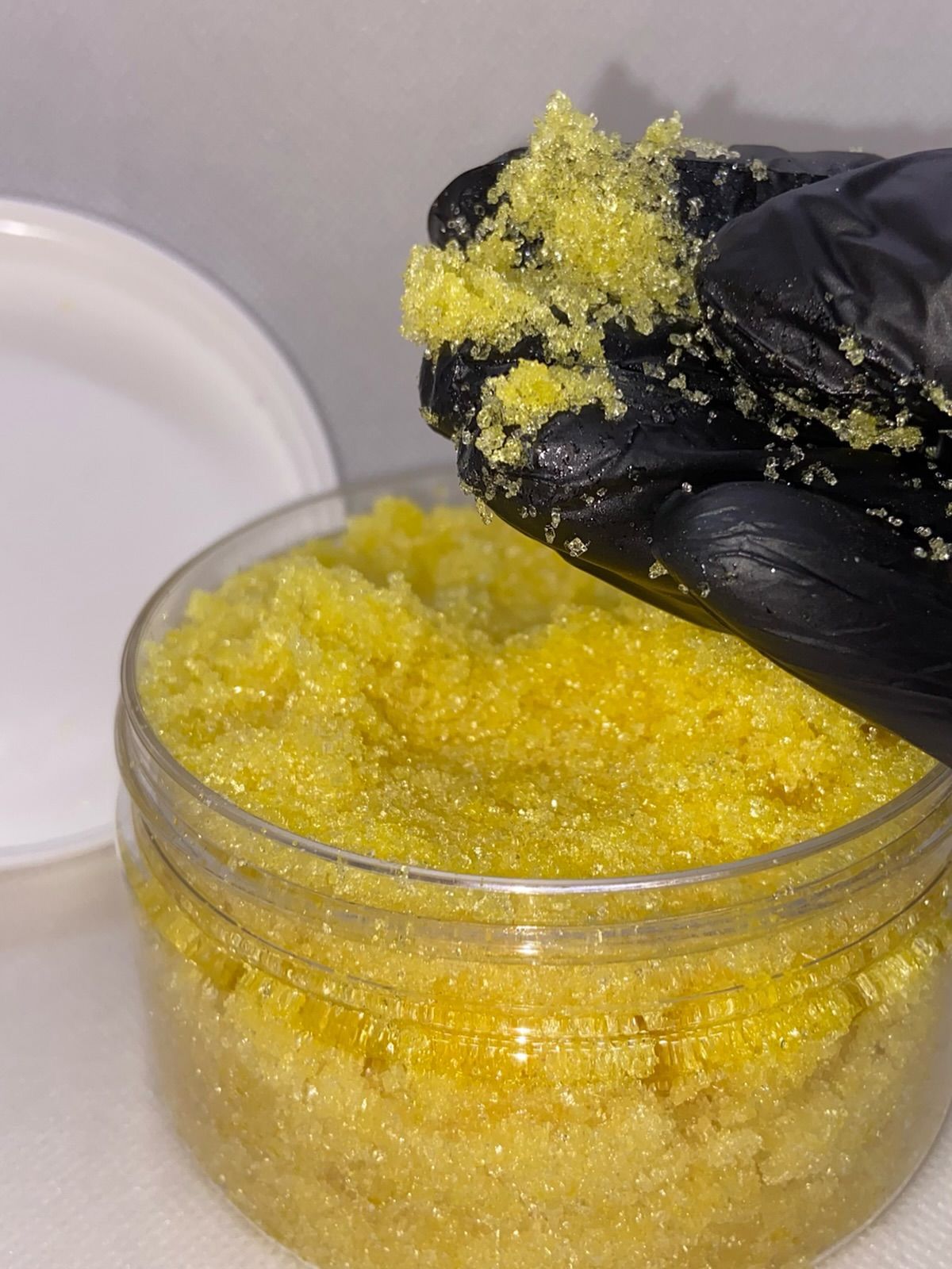 Vibrant Texture: A thick, luscious golden-yellow scrub that feels luxurious to the touch.